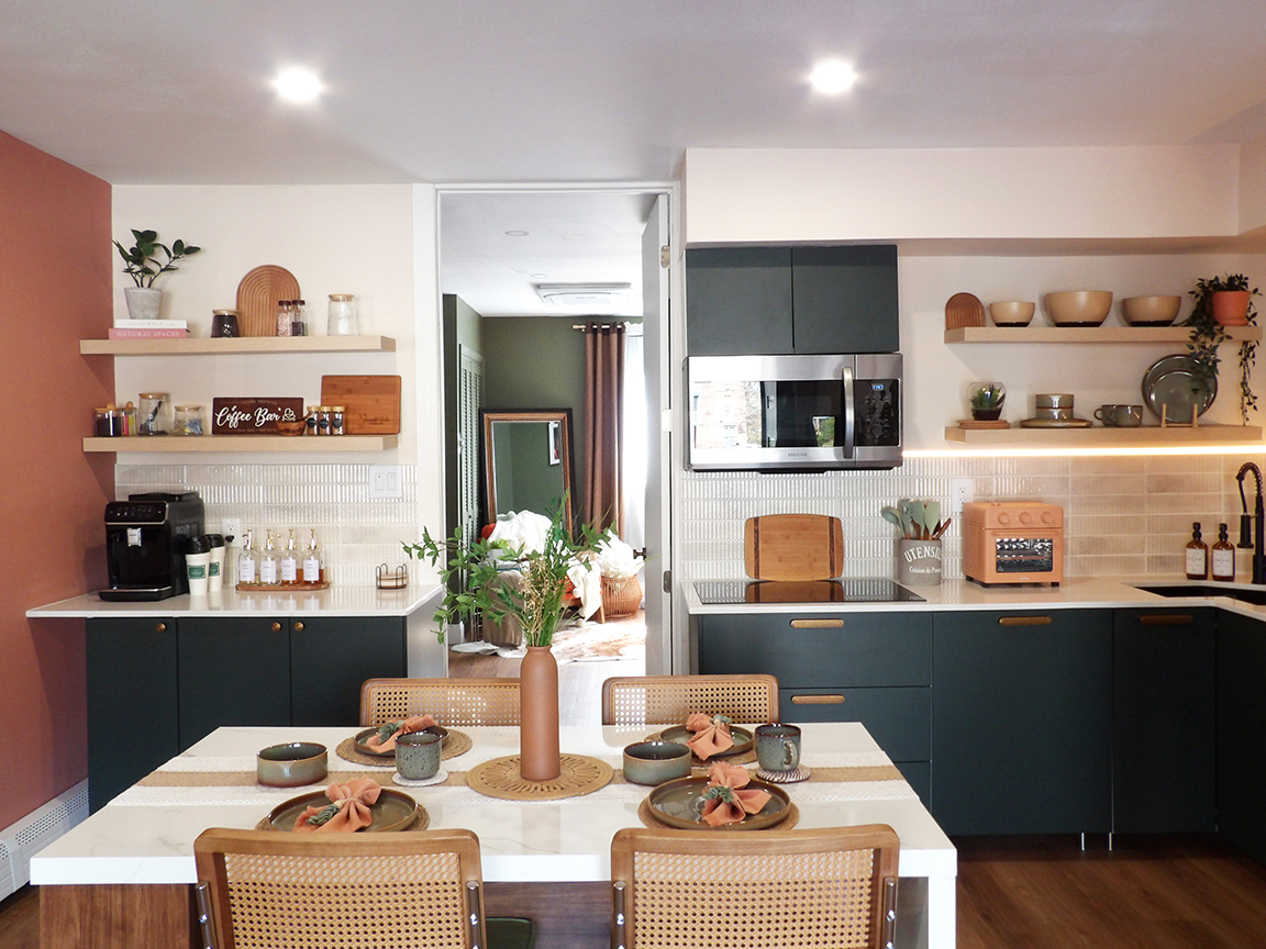 The Emerald is a thoughtfully designed retreat that blends quiet luxury with the effortless charm of mid-century modern style. Located in Randall Manor, one of Staten Island’s most sought-after neighborhoods, the suite features warm textures, clean lines, and an open floor plan that create a calm, sophisticated space that feels like your home away from home.